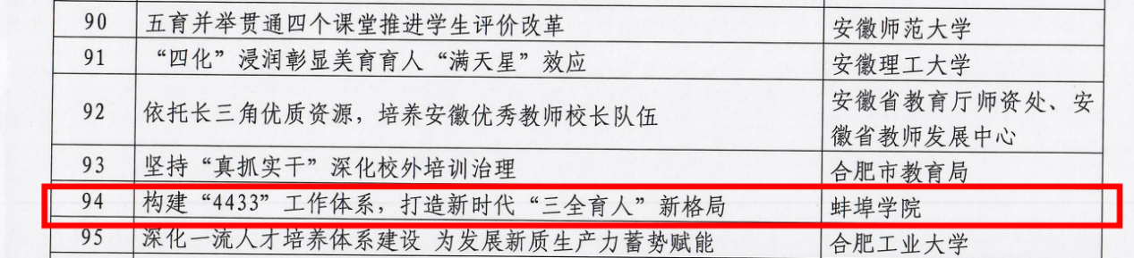 蚌埠学院报送的“构建‘4433’工作体系,打造新时代‘三全育人’新格局”综合改革实践案例,立足地方应用型高校办学定位,凭借鲜明特色与显著成效成功入选,彰显了学校在立德树人与教育现代化建设领域的示范影响力。