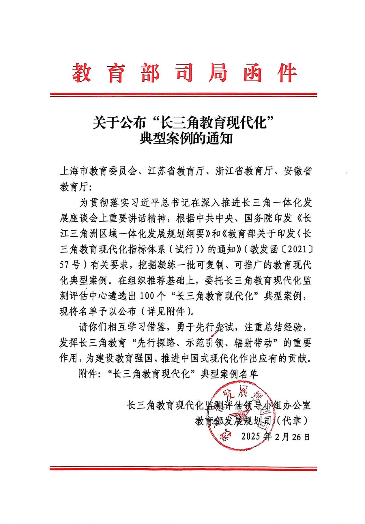 近日,长三角教育现代化监测评估成果发布会在上海举行,会上正式公布《长三角教育现代化典型案例100》入选名单。本次案例征集由教育部发展规划司指导、聚焦长三角地区教育现代化创新实践,覆盖三省一市各级各类教育单位,经省级推荐、专家评审等严格环节,最终遴选出100项可复制、可推广的典型成果。